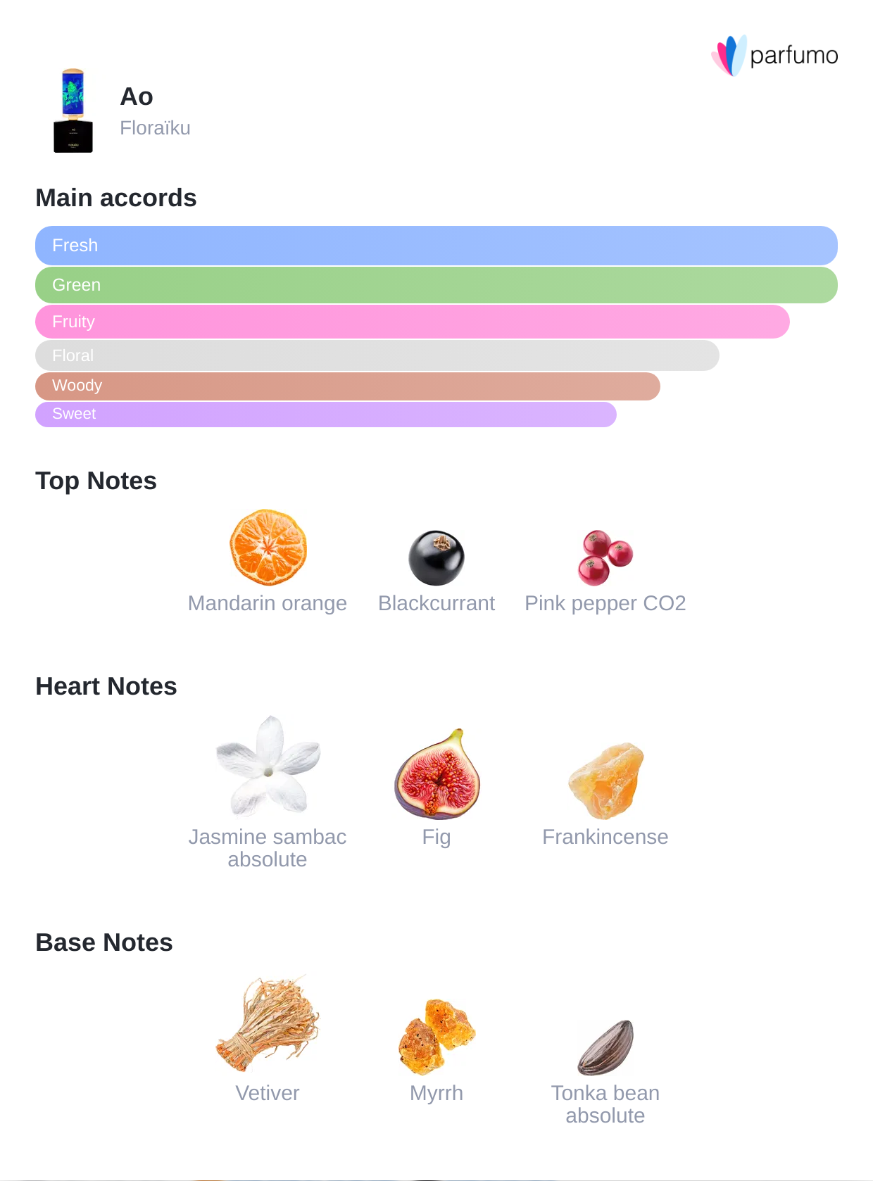 AO: Ao (é’) is Japanese for "Blue-Green". Exactly as gems can do, according to the light, and the purity of the stone. Here, they stand facetted like a fragrance, revealing a range of slight nuances. AO combines Tangerine oil with notes of warm, woody Figs and Myrrh oil and lead to a fruity fragrance that develops elegantly on the skin.