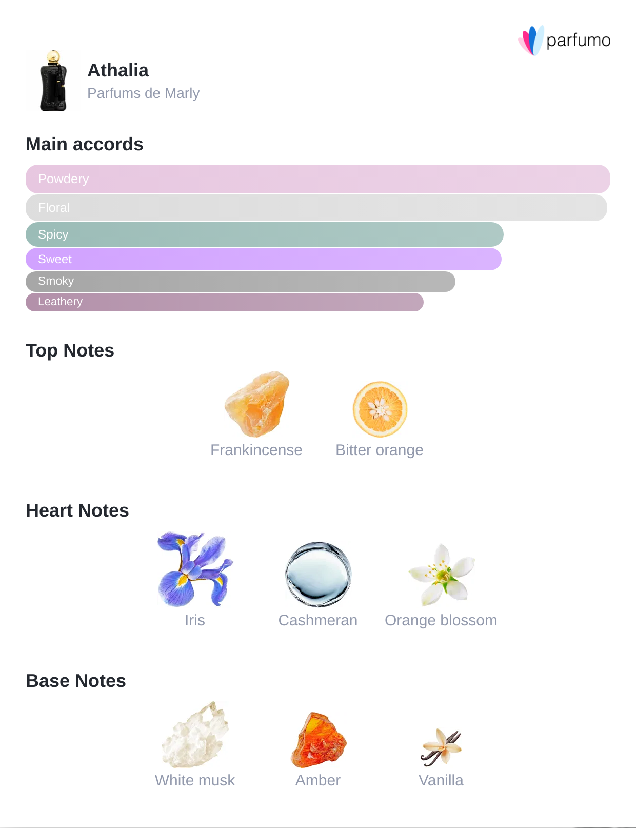 Athalia: Athalia boasts a highly floral, woody and musky olfactory signature. Top notes of bitter orange and incense lead the wearer to the heart of this feminine eau de parfum, which combines powdery iris and delicate orange blossom enveloped in mysterious amber and caressed by white musk. It is an intriguing fragrance with a delicate opulence.