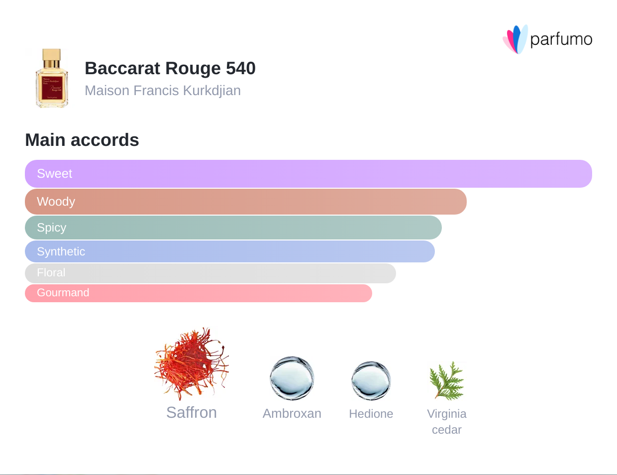 Baccarat Rouge 540: Baccarat Rouge 540 was inspired by the collaboration between Maison Francis Kurkdjian and the legendary crystal maker Baccarat, created to honor the crystal house's 250th anniversary. This iconic fragrance mirrors the elegance and craftsmanship of Baccarat's exquisite crystal, especially the brand's signature red crystal, made by fusing clear crystal with 24-carat gold powder and heating it to 540 degrees Celsius, hence the name "540." The result is a scent that radiates the same brilliance and refinement, combining airy jasmine, luminous saffron, and mineral ambergris to evoke the sleek, glass-like clarity and warmth of Baccarat crystal.