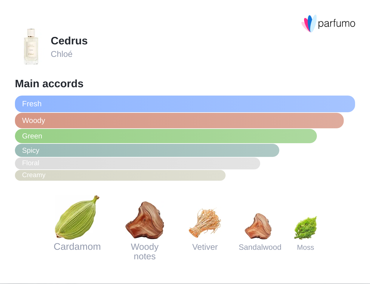 Cedrus: Nature is a precious source of fragrant flowers and aromatic leaves. Drawing on this wide variety of natural bouquets, the House of Chloé has collaborated with renowned perfumers to create the Atelier des Fleurs line. This prestigious collection celebrates the art of floral composition with a set of complementary perfumes, each with a unique signature rooted in the perfumer’s memory. The fragrances are designed to work in harmony in endless combinations. Behind this woody Eau de Parfum, with either tender and subtle, or warm and musky notes, lies the perfumer’s childhood memory of a playful lover's gift: a bouquet of branches that Quentin Bisch’s father gave to his mother.