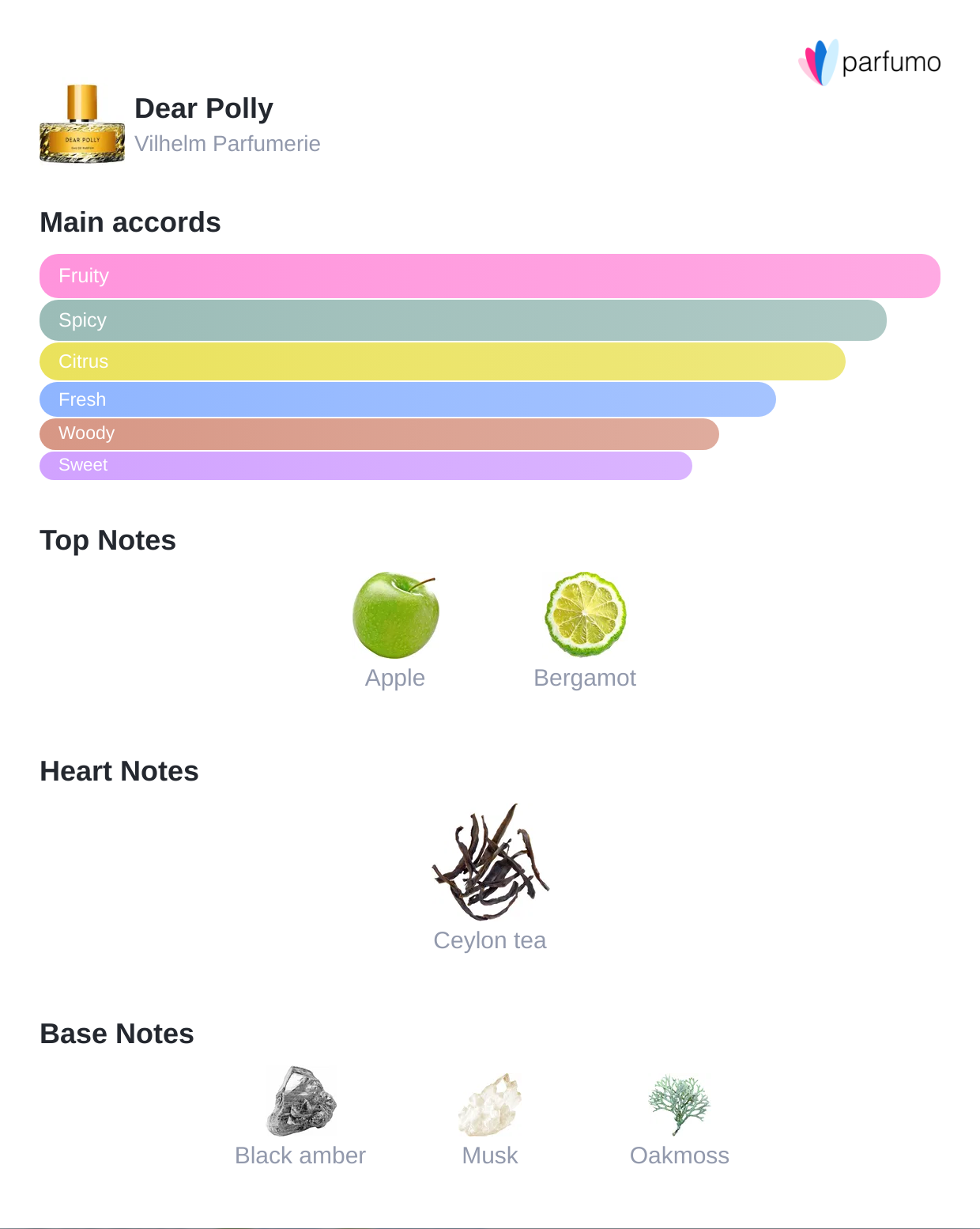 Dear Polly: "Dear Polly is a love letter in scent to my wife. Black tea, like the brew with which she awakes each morning, immediately warms the skin. Top notes of apple and bergamot create a sense of familiarity, while sensuous musk introduces complexity. Finally, it finds its resolution in a voluptuous spice, as piquantly punctuated as it is seductively honeyed. Familiar and new, comfortable and invigorating, it is a fragrant brew for two: lovers can wear it and recall each other. Even with distance they're never apart." - a note from the brand.