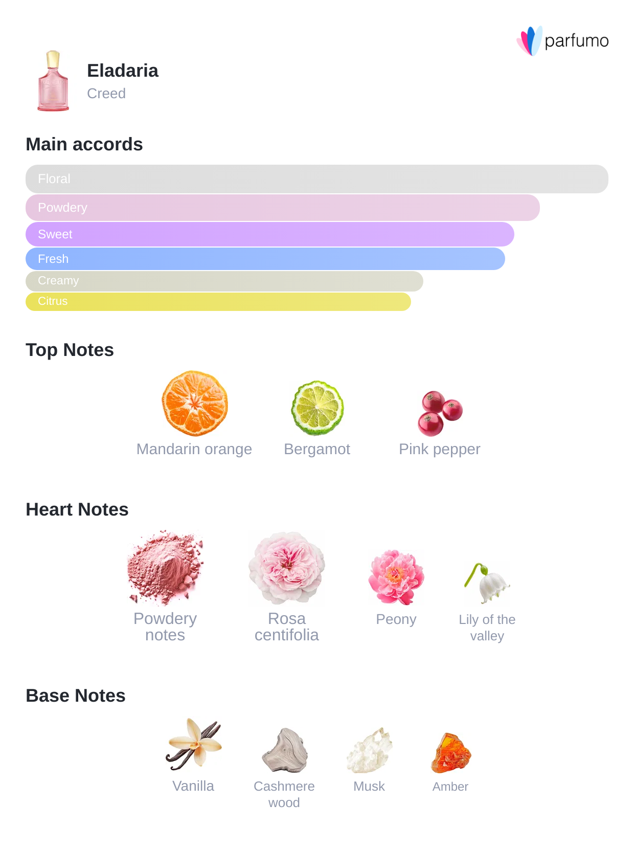 Eladaria: This enchanting scent reimagines the classic rose in a modern, radiant composition, blending light and shadow, sensuality and freshness. Inspired by a paradisiacal garden at dawn, Eladaria reflects the beauty of awakening nature with a vibrant play of floral calligraphy, powdery textures, and shimmering citrus accents.