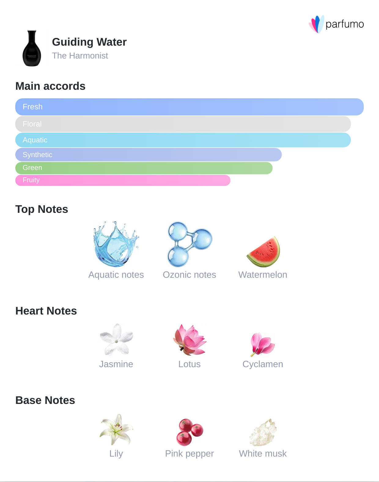 Guiding Water EDP: Guiding Water is a calming fragrance that restores the wearer like the dew that dapples blossoms in the morning light. The aquatic freshness of Ozonic Accord and Pink Peppercorn are paired with a bouquet of Cyclamen, Jasmine and Fleur-de-Lys. Fluid and subtle, it's a delicate Yin scent that awakens and refines.