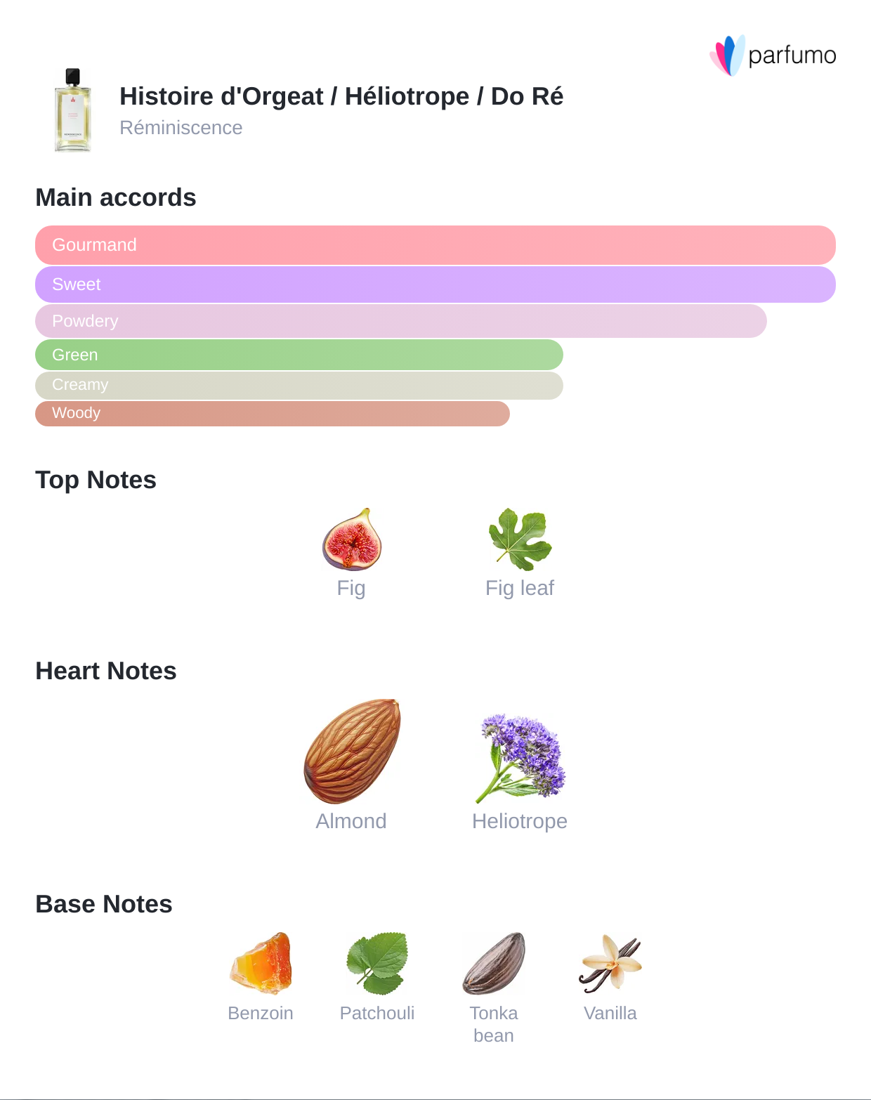 Histoire d'Orgeat / Héliotrope / Do Ré (Discountinued, Rare): Gourmand Heliotrope is a new addition to the Remiscence collection. Green color of the flacon is characteristic of this edition which starts with sweet and juicy figs and green notes, announcing heliotrope in the heart supported by almond, cedar, sandalwood and patchouli. A base is comfortable and soft, created of sensual vanilla, warm tonka, benzoin and musk.