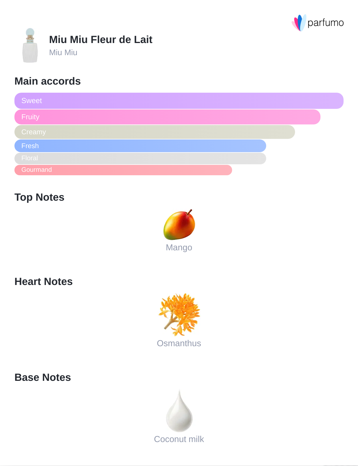 Miu Miu Fleur de Lait: Inspired by the iconic Mango Pomelo Sago dessert, Miu Miu Fleur de Lait Eau de Parfum is the floral-fruity fragrance in which mouth-watering top notes of juicy mango blend with delicate osmanthus petals and velvety notes of coconut milk to create a bold, captivating, and refined fragrance.