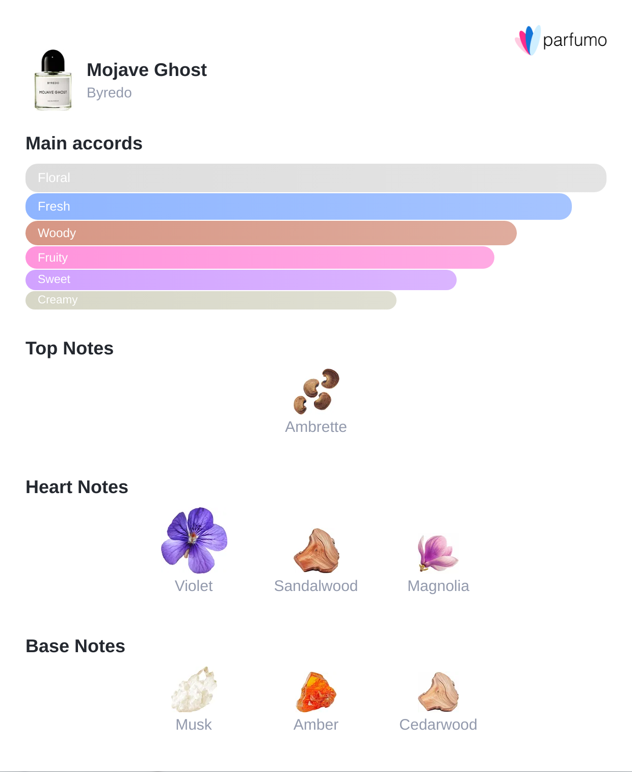 Mojave Ghost EDP: Mojave Ghost is an ode to the raw beauty and enduring spirit of the Mojave Desert, where only the most resilient flowers can bloom amidst the vast, arid landscape. The fragrance opens with the delicate yet powerful essence of Magnolia, balanced by the warmth of rare Sandalwood, flourishing in this unforgiving environment. As it unfolds, powdery Violet and crisp Cedarwood evoke the quiet strength of desert flora. The base of Musks, Vetiver, and Cedarwood leaves a lasting impression of resilience and elegance, embodying grace and the rare beauty that survives the desert’s harshness.