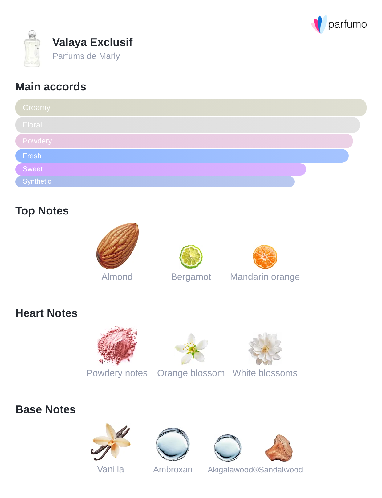 Valaya Exclusif: A radiant aura and yet, an impalpable softness. This elegant floral-musky-woody fragrance created by Julien Sprecher is a unique play on codes, materials and subtle contrasts. An evocation of the skin caressed by a veil of cotton. Fresh top notes as bergamot, mandarin and sweet white peach, lead to a blend of white flowers, settling on musk and ambrofix sensual base notes.