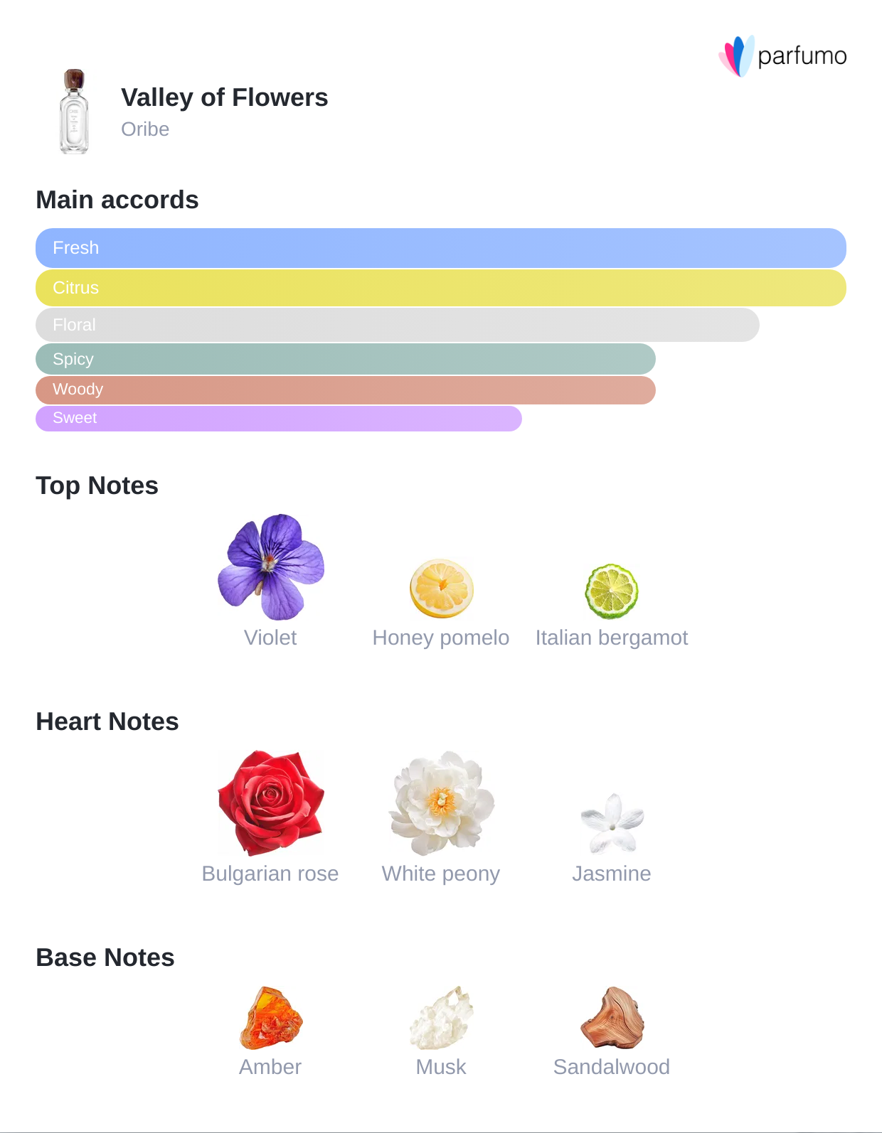 Valley Of Flowers: Wander into a vibrant field in full flower. Fresh notes of Bulgarian rose, jasmine petals and peony blossoms soften into a long-lasting trail of warm amber, textured woods and creamy musk. Lose yourself in the Valley of Flowers.