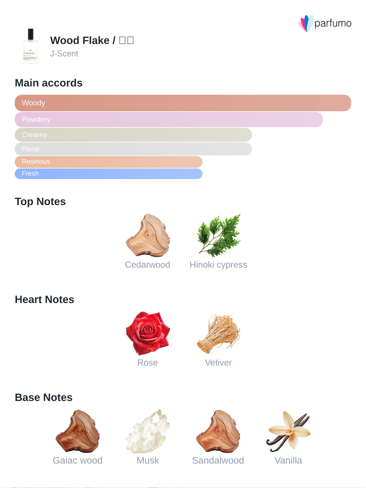 Woodflake: Subtle and calming scent of wood chip and wood scrap This fragrance represents the multifaceted nature of wood scents, which expresses a certain peacefulness and beauty of nature. From the delicate fragrance of a pile of sawdust, to the sharper aroma of a curled-up piece of wood shaving, and the slightly sweet smell of lumber, this scent represents the subtly different fragrances of wood chips and scrap wood.